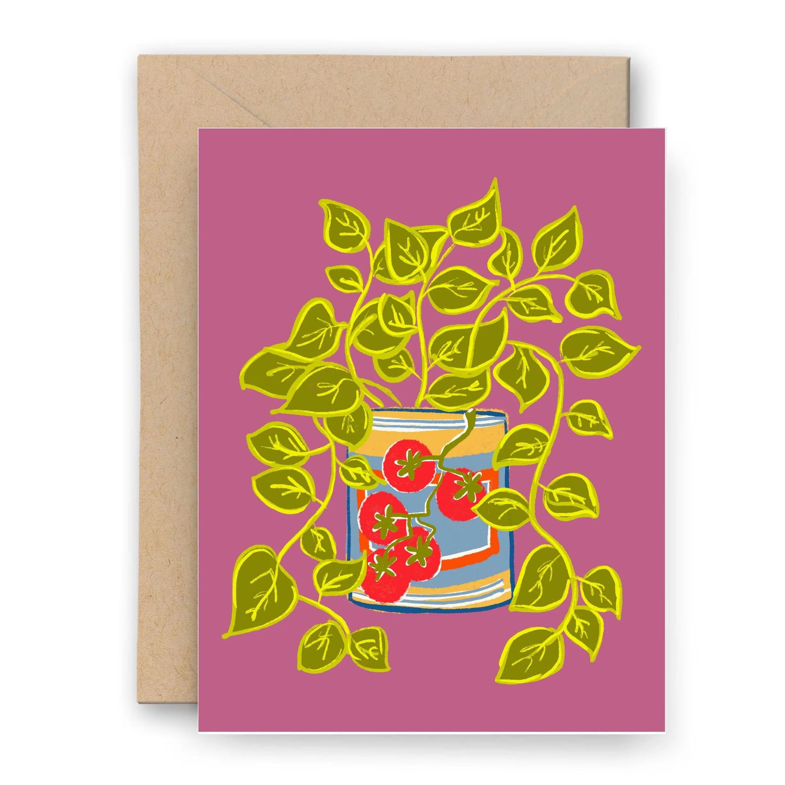 A cylindrical terracotta pot with blue and white painted abstract design.